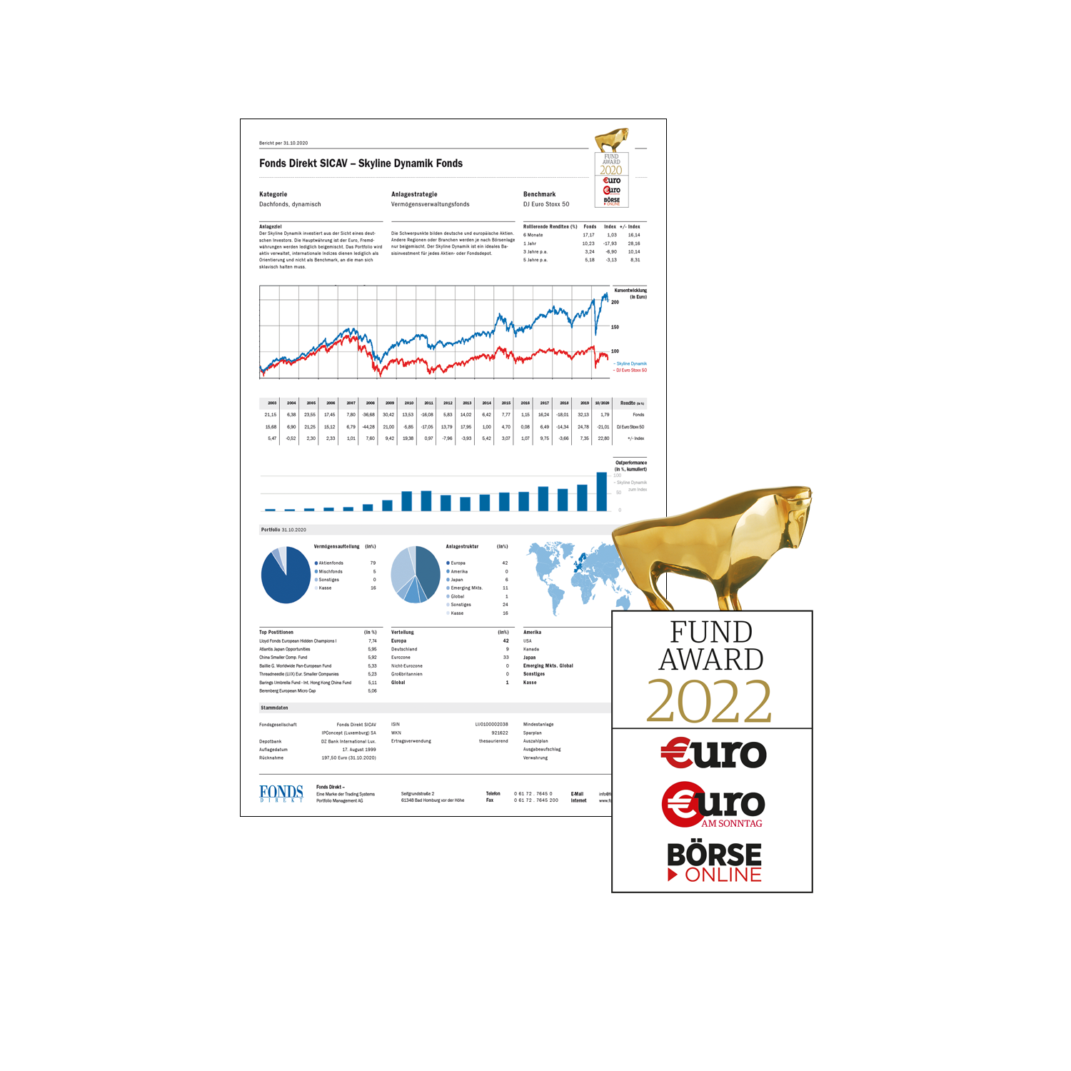 Im vermögensverwaltenden Skyline Dynamik Fonds werden herausragende Investmentfonds aus den interessantesten Regionen und Branchen der Welt in einem aktiv gemanagten Portfolio gebündelt. Dabei betrachten wir die Welt aus der Sicht eines deutschen Anlegers. Anders als bei vielen internationalen Portfolios orientiert sich die Zusammensetzung daher nicht am weltweiten Aktienindex MSCI Welt, der Schwerpunkt der Investitionen wird vielmehr bewusst auf deutsche und europäische Titel gelegt.